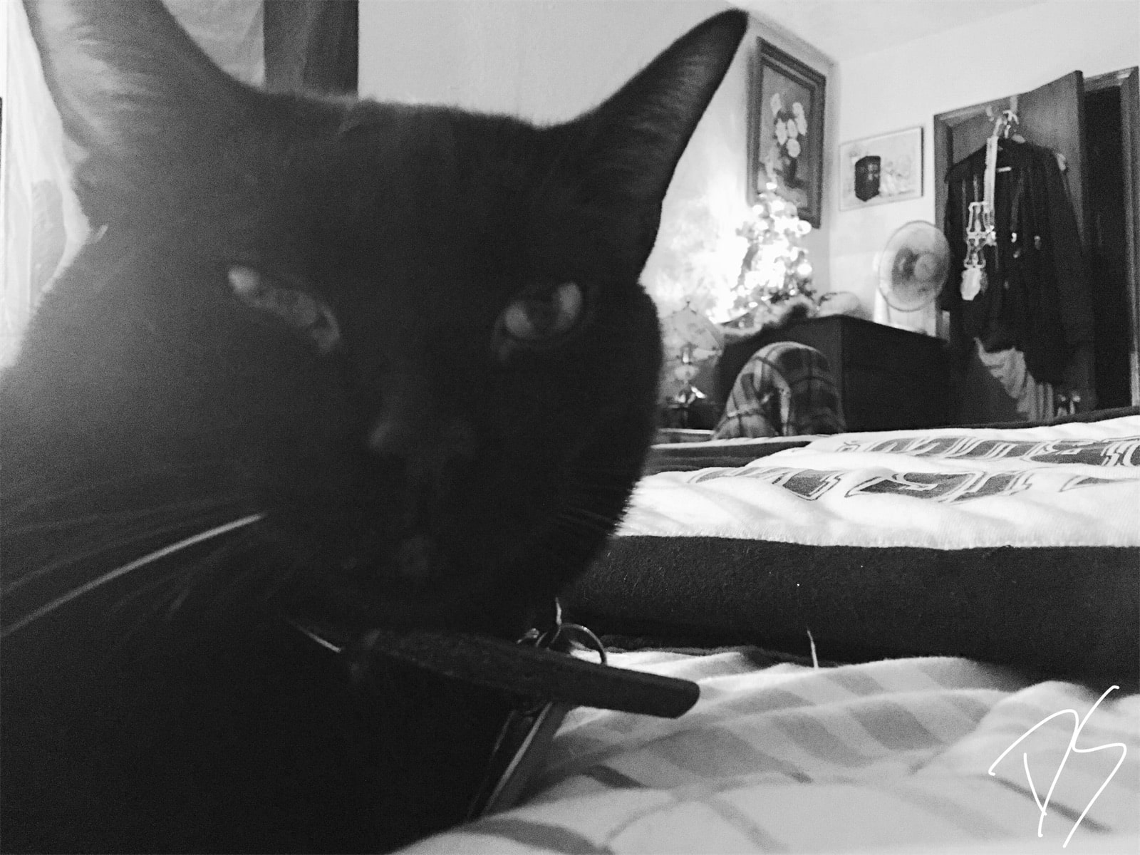 I took this photo in December 2018 during my winter break. This photos become a wonderful header photo for my blogs and I just love how my cat, Jupiter, just sits and stares at me (as he always does). Notice where my cat’s at in the photo: left side of the photo, leaving the right side for everyone to look in the distance. Notice the tiny three foot Christmas tree and a sneak peak of my 500 square foot apartment. This photos another solid example of black and white contrasts.