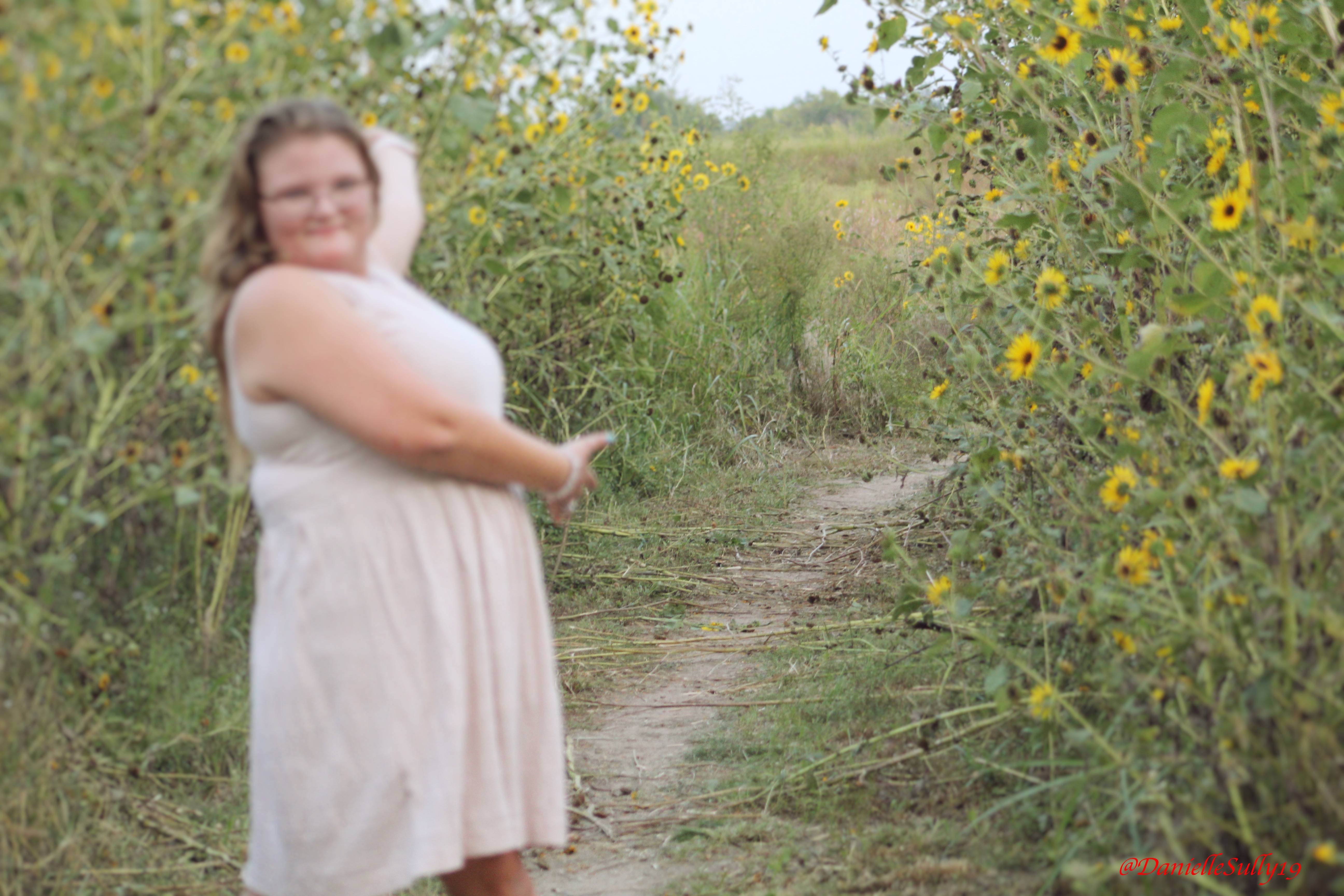 Notice how the focus of the picture is in the far right section of the photo, in the area of the trail and flowers. The area that’s blurry is me, edging the viewer to walk into the fairy garden with me. That’s what I was picturing in my own mind as this sunset photo was taken. While the camera was on auto focus, the stand in camerawomen hadn’t waited long enough to allow the camera to be in focus for me and not as in focus for the pathway. I’ve gone through and edited this photo just a tad to make it brighter and with a bit more sharpness to it so you can see the definitions of the area around me. The left photo is the original photo: